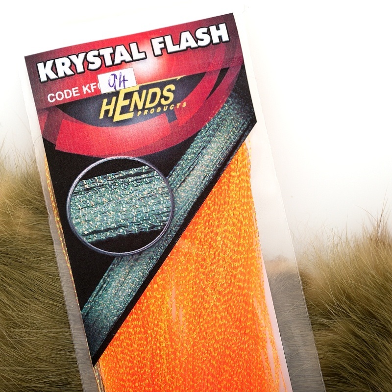 Hends Krystal Flash je těžko nahraditelný materiál při konstrukci především streamerových mušek. Svým leskem a pohybem udělá z obyčejné mušky účinnou zbraň. Můžeme ho také použít na mnoho dalších částí jiných typů mušek jako jsou střapečky, tipy, kroužkování apod.