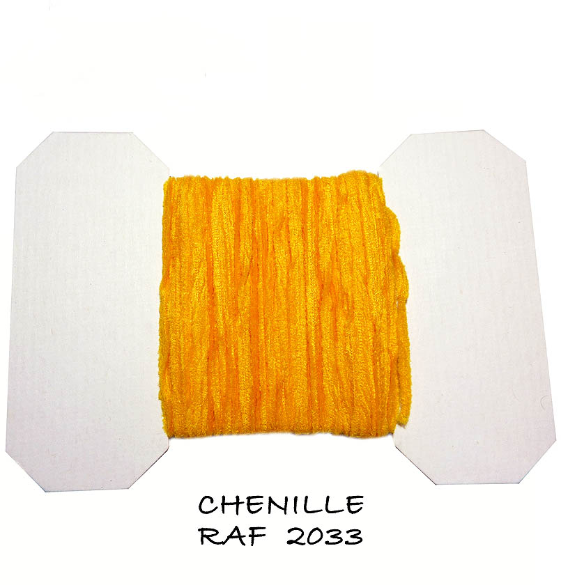 Plochá šenylka RAF je velmi zajímavý materiál na vázání tělíček mušek typu: lura, wolly bugger, wolly worm a streamery a všude tam, kde potřebujeme vytvořit tenké tělíčko mušky.