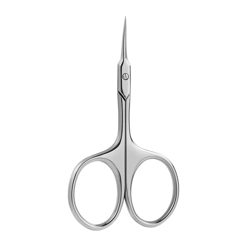 Profesionální nerezové nůžky se zahnutou čepelí pro precizní dopracování nejjemnějších detailů.